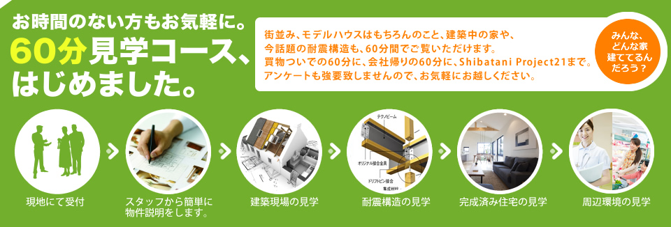 街並み、モデルハウスはもちろんのこと、建築中の家や、今話題の耐震構造も、60分間でご覧いただけます。 買物ついでの60分に、会社帰りの60分に、Shibatani Project21まで。 アンケートも強要致しませんので、お気軽にお越しください。
